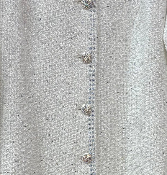 - Exude sophistication in our Elegant Charm Tweed Robe, crafted in luxurious white tweed with crystal-trimmed buttons. A graceful, modest design perfect for church or any special occasion.